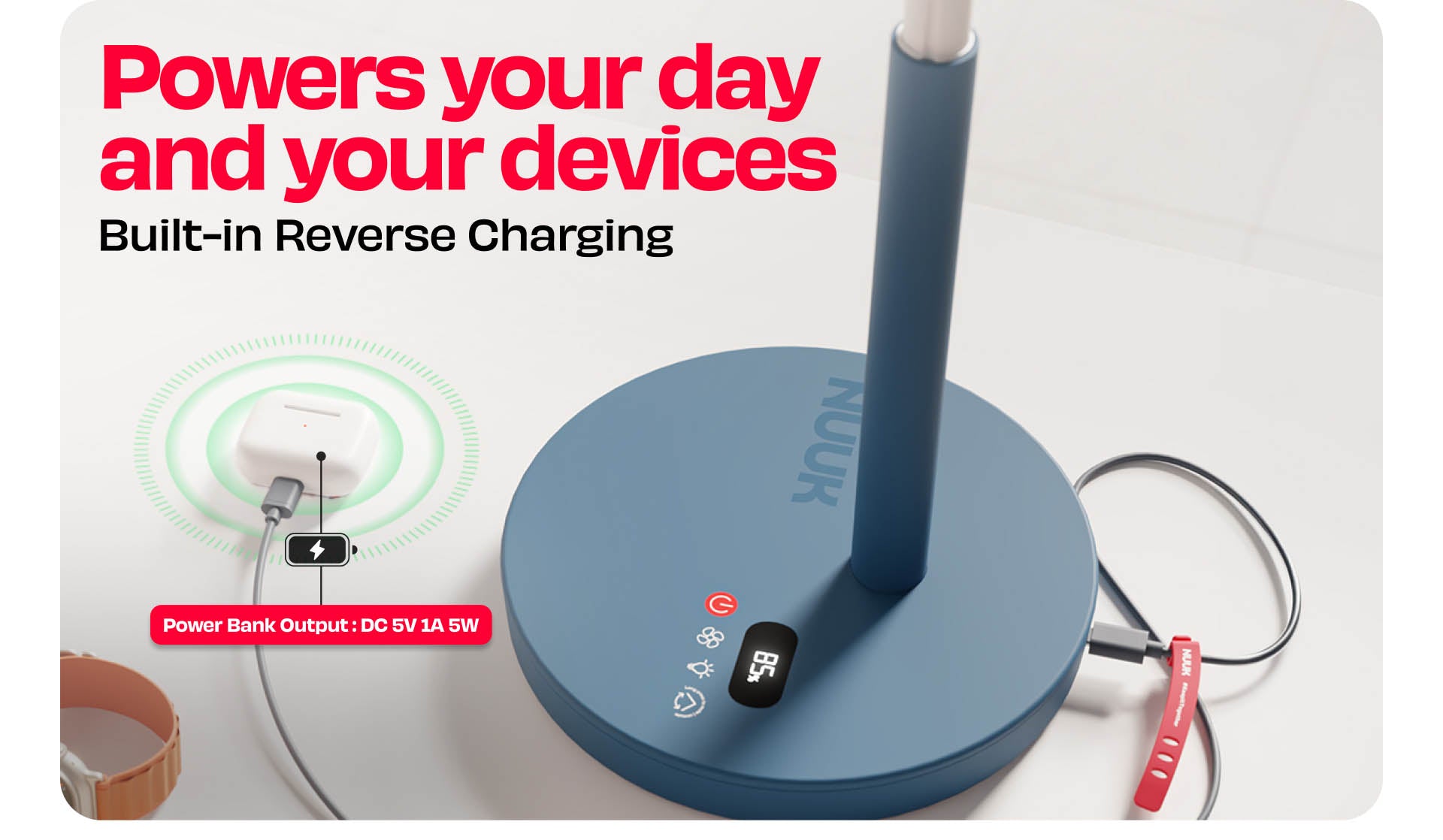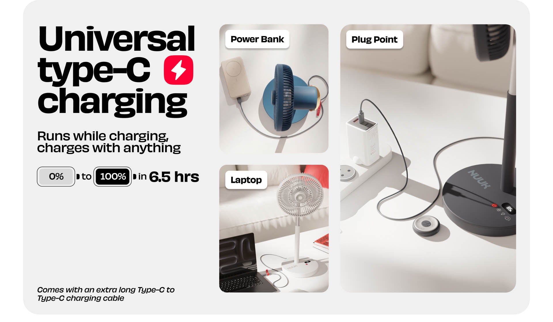 The Battery variant runs 3–20 hours depending on speed, and supports pass‑through charging.