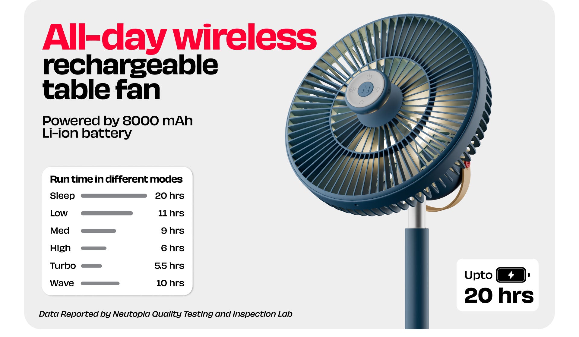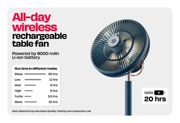 Up to 20 hrs, depending on the speed, perfect for all-day or overnight use.