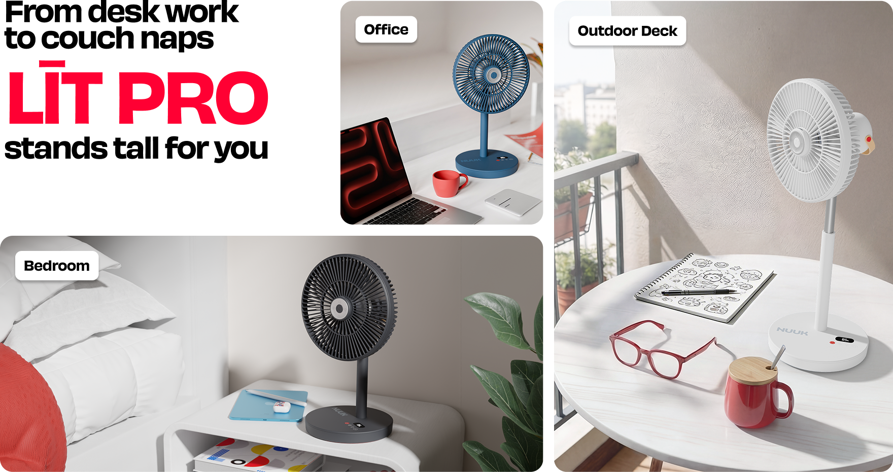 LĪT PRO is a rechargeable fan designed for modern homes, delivering powerful airflow, all-day battery life, and adjustable height for flexible use.